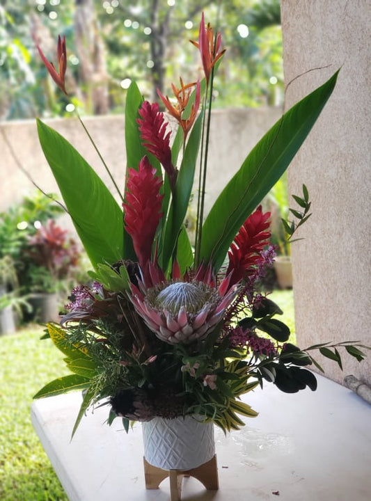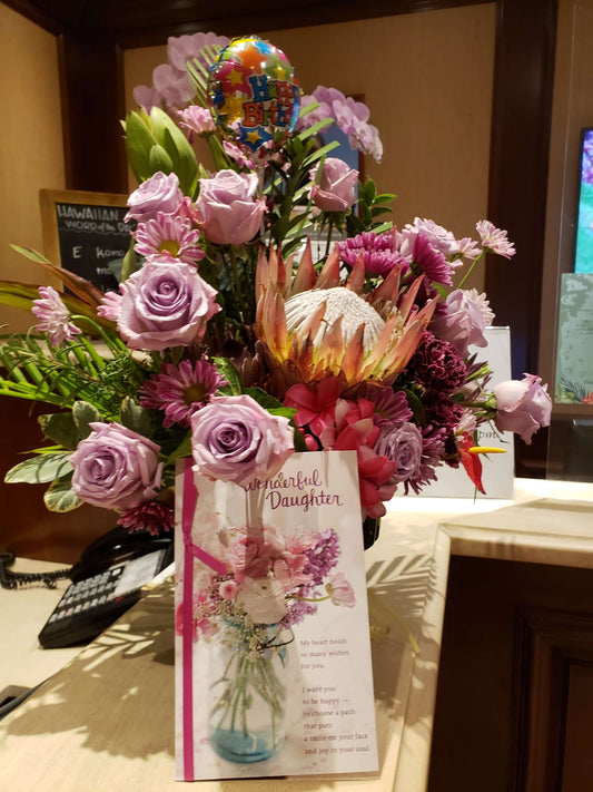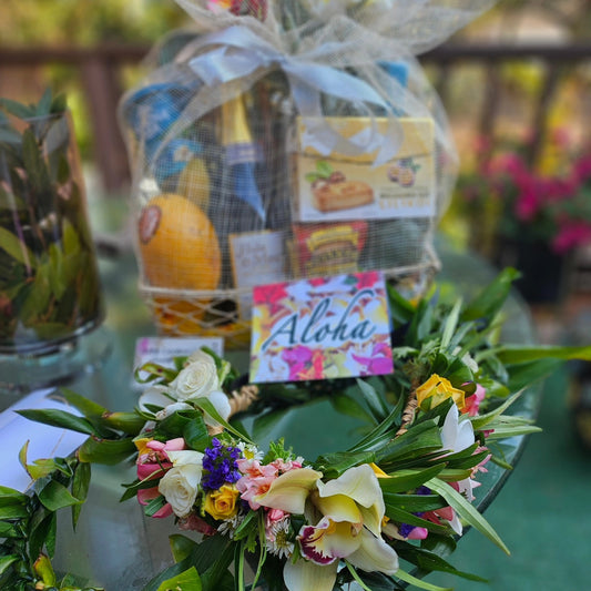 Their service far exceeded any expectations I could have had. She put together the most beautiful basket with fresh flower let's, champagne, chocolate's, cake+, a mug. The presentation of the gift and artwork in the let's was beautiful and she went above and beyond from what we even discussed initially. She even made a beautiful header and neck lei for my son just for returning her basket afterwards since we weren't needing it anyway. She was a pleasure to work with and I would highly recommend her.